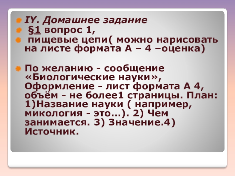 IY. Домашнее задание §1 вопрос 1, пищевые цепи( можно нарисовать на листе формата А – 4 –оценка)По