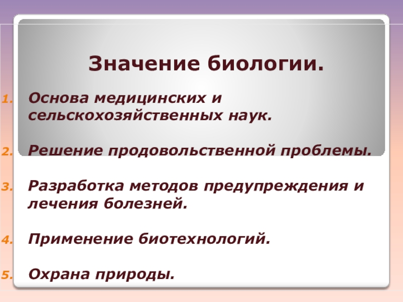 Значение биологии.Основа медицинских и сельскохозяйственных наук.Решение продовольственной проблемы.Разработка методов предупреждения и лечения болезней.Применение биотехнологий.Охрана природы.
