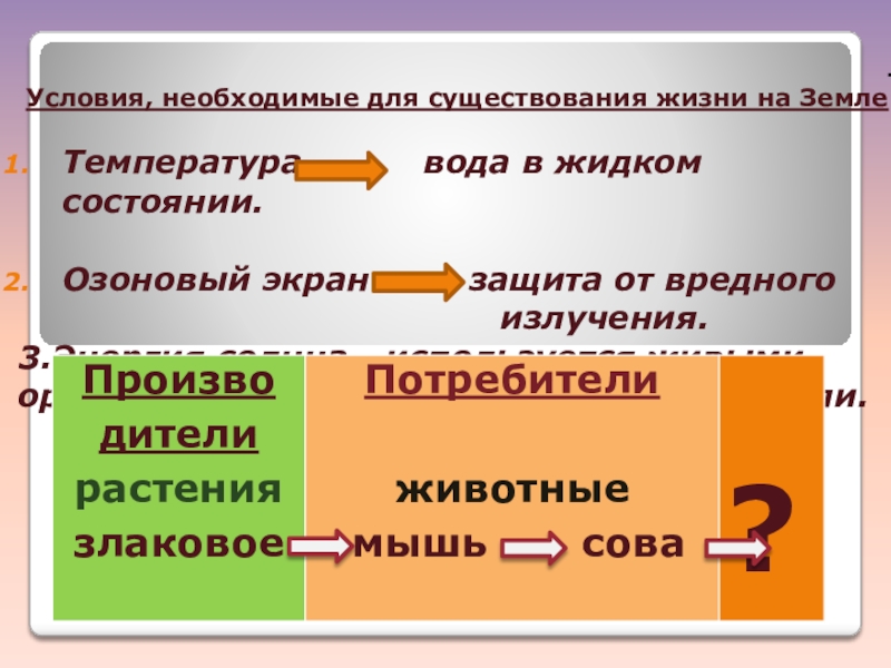 .Условия, необходимые для существования жизни на ЗемлеТемпература      вода в жидком состоянии.Озоновый экран