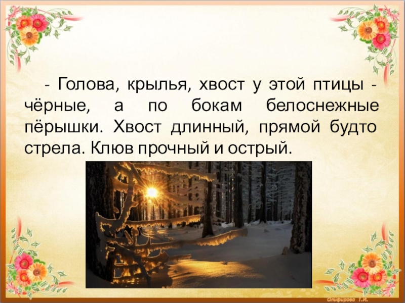 Слайд 22 - Голова, крылья, хвост у этой птицы - чёрные, а по