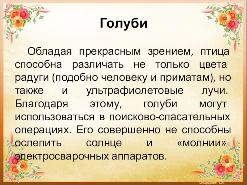 человеку и приматам), но также и ультрафиолетовые лучи. Благодаря этому, голуби могут использоваться в поисково-спасательных операциях. Его совершенно не способны ослепить солнце и «молнии» электросварочных аппаратов.