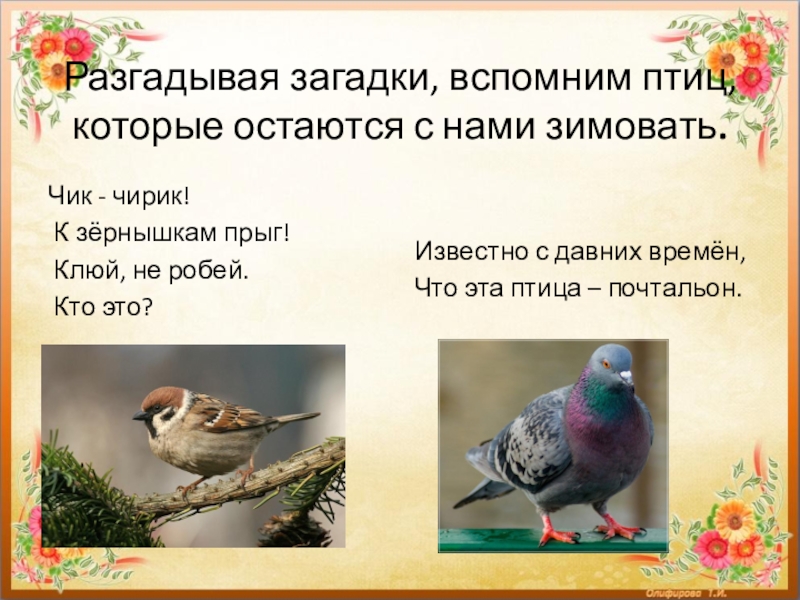 Слайд 4Разгадывая загадки, вспомним птиц, которые остаются с нами зимовать.