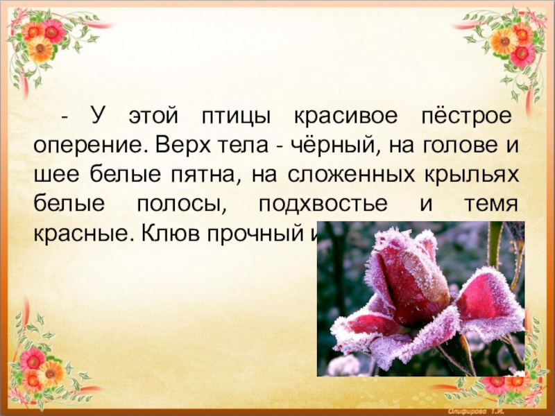 Слайд 19 - У этой птицы красивое пёстрое оперение. Верх тела - чёрный,