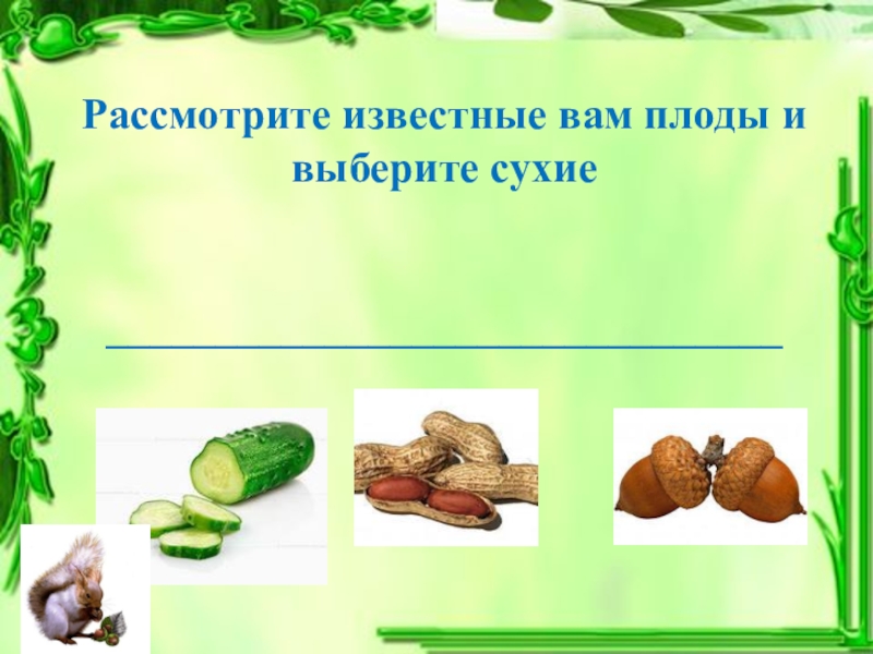 Слайд 5Рассмотрите известные вам плоды и выберите сухие _______________________________