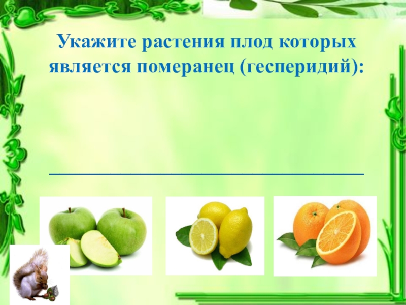 Слайд 7Укажите растения плод которых является померанец (гесперидий): _______________________________