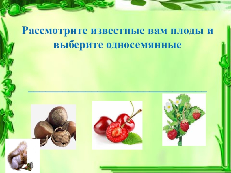 Слайд 8Рассмотрите известные вам плоды и выберите односемянные _______________________________