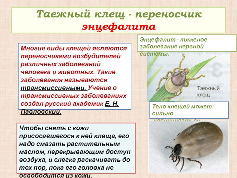 Чтобы снять с кожи присосавшегося к ней клеща, его надо смазать растительным маслом, перекрывающим доступ воздуха, и слегка раскачивать до тех пор, пока его головка не освободится из кожи.