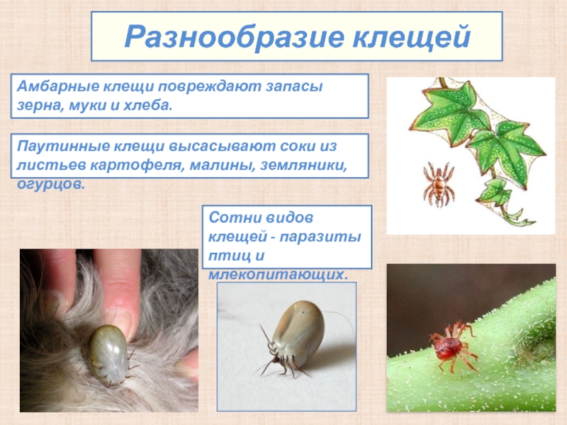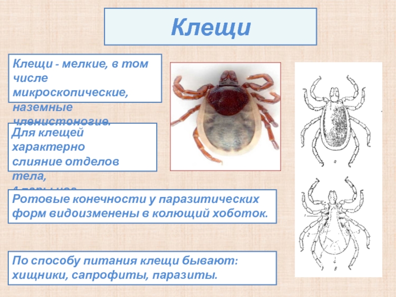 По способу питания клещи бывают: хищники, сапрофиты, паразиты.