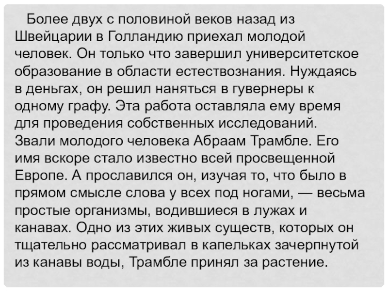 Звали молодого человека Абраам Трамбле. Его имя вскоре стало известно всей просвещенной Европе. А прославился он, изучая то, что было в прямом смысле слова у всех под ногами, — весьма простые организмы, водившиеся в лужах и канавах. Одно из этих живых существ, которых он тщательно рассматривал в капельках зачерпнутой из канавы воды, Трамбле принял за растение.