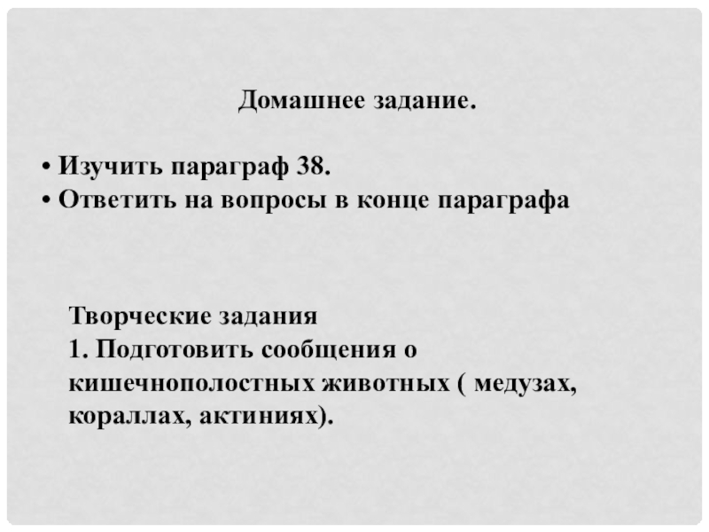 1. Подготовить сообщения о кишечнополостных животных ( медузах, кораллах, актиниях).