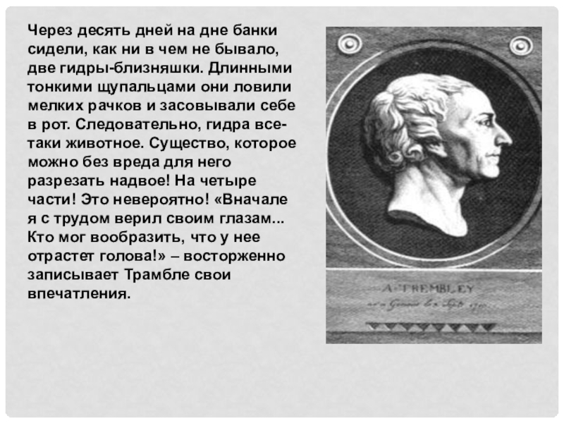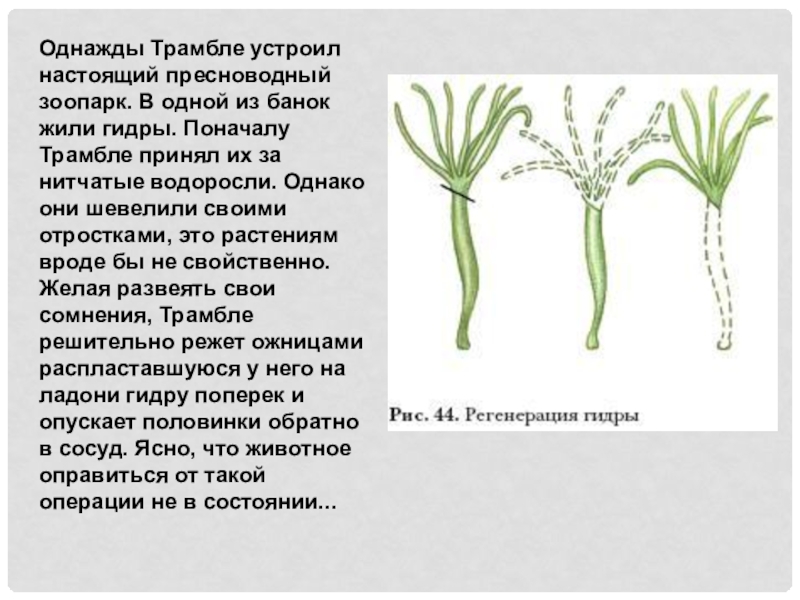 гидры. Поначалу Трамбле принял их за нитчатые водоросли. Однако они шевелили своими отростками, это растениям вроде бы не свойственно. Желая развеять свои сомнения, Трамбле решительно режет ожницами распластавшуюся у него на ладони гидру поперек и опускает половинки обратно в сосуд. Ясно, что животное оправиться от такой операции не в состоянии...