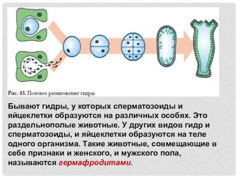 Это раздельнополые животные. У других видов гидр и сперматозоиды, и яйцеклетки образуются на теле одного организма. Такие животные, совмещающие в себе признаки и женского, и мужского пола, называются гермафродитами.
