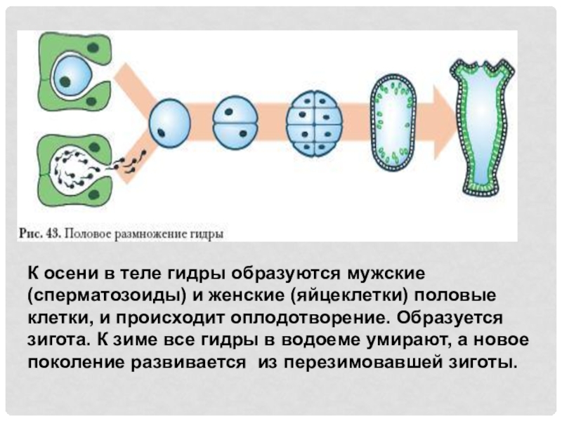 половые клетки, и происходит оплодотворение. Образуется зигота. К зиме все гидры в водоеме умирают, а новое поколение развивается из перезимовавшей зиготы.