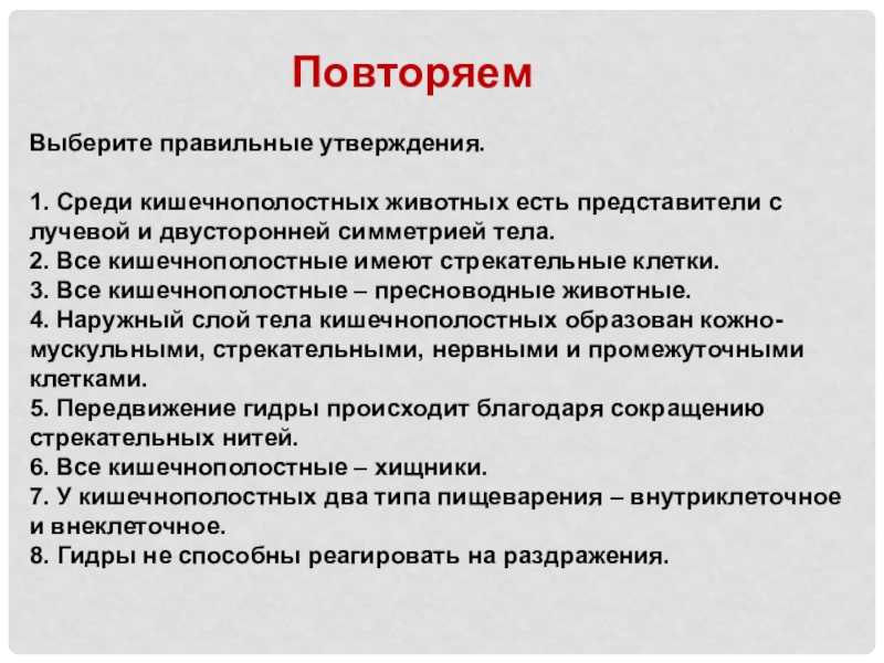 7. У кишечнополостных два типа пищеварения – внутриклеточное и внеклеточное.