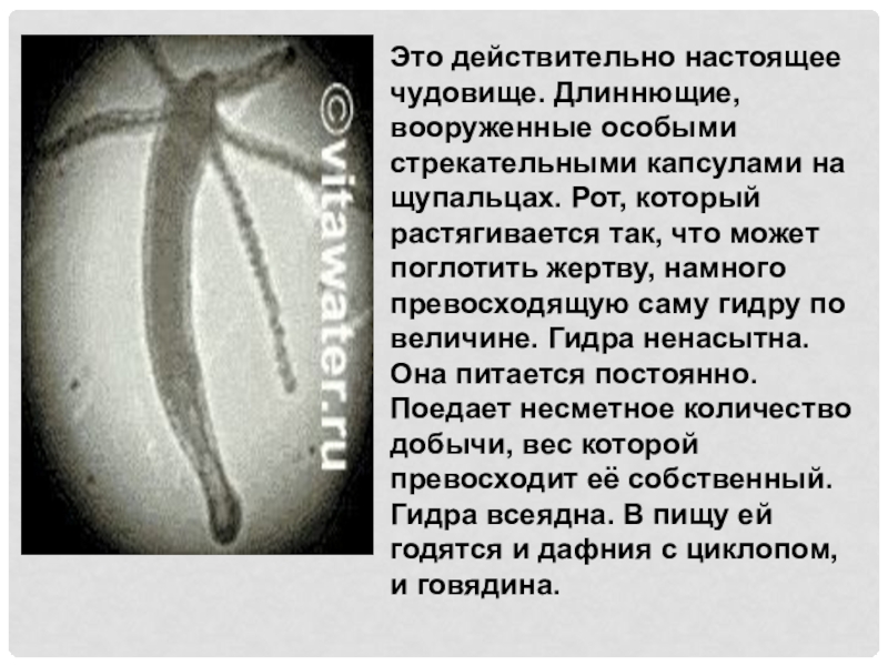 Рот, который растягивается так, что может поглотить жертву, намного превосходящую саму гидру по величине. Гидра ненасытна. Она питается постоянно. Поедает несметное количество добычи, вес которой превосходит её собственный. Гидра всеядна. В пищу ей годятся и дафния с циклопом, и говядина.