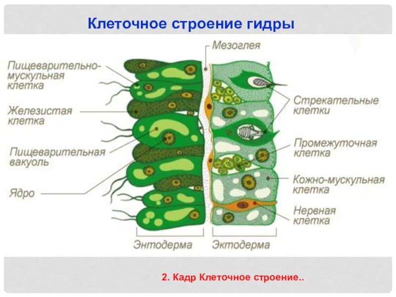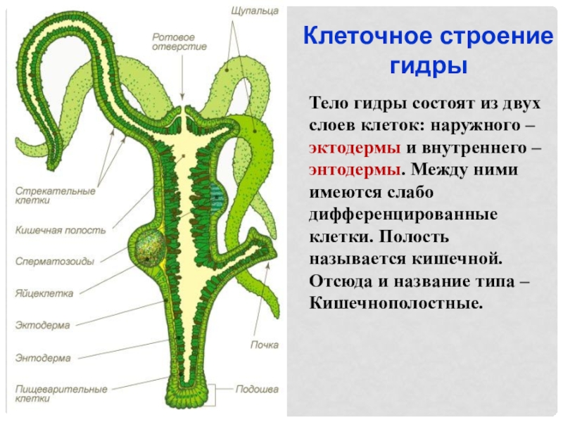 эктодермы и внутреннего – энтодермы. Между ними имеются слабо дифференцированные клетки. Полость называется кишечной. Отсюда и название типа – Кишечнополостные.