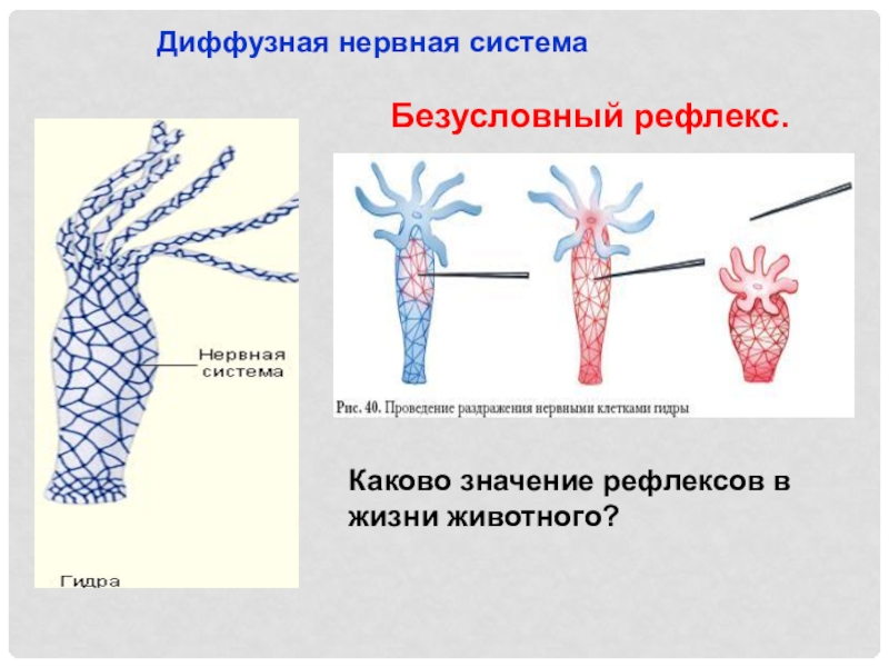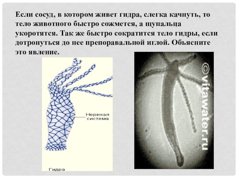быстро сожмется, а щупальца укоротятся. Так же быстро сократится тело гидры, если дотронуться до нее препоравальной иглой. Объясните это явление.