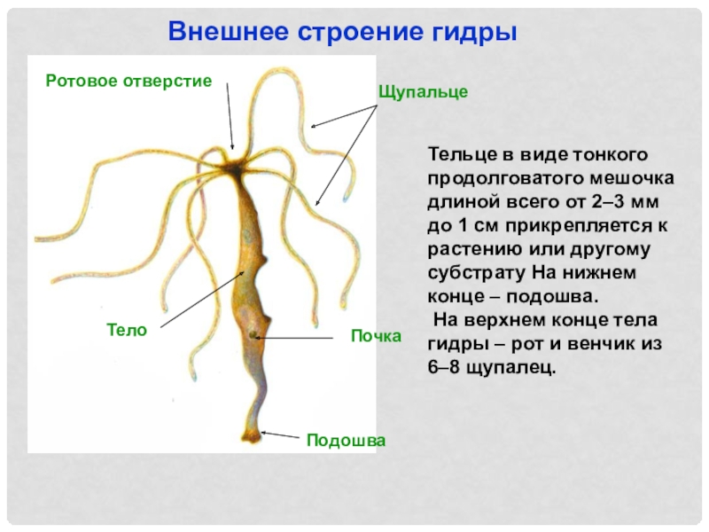 На верхнем конце тела гидры – рот и венчик из 6–8 щупалец.