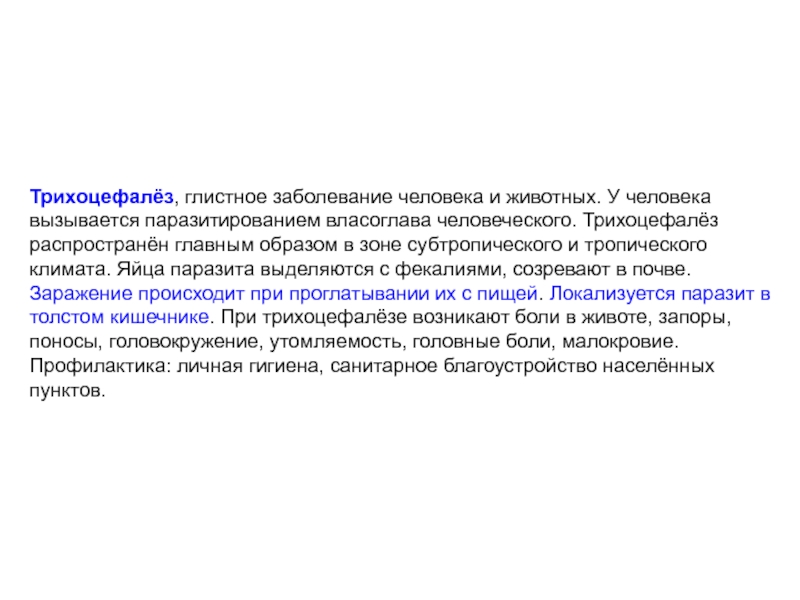 Слайд 11Трихоцефалёз, глистное заболевание человека и животных. У человека вызывается паразитированием власоглава