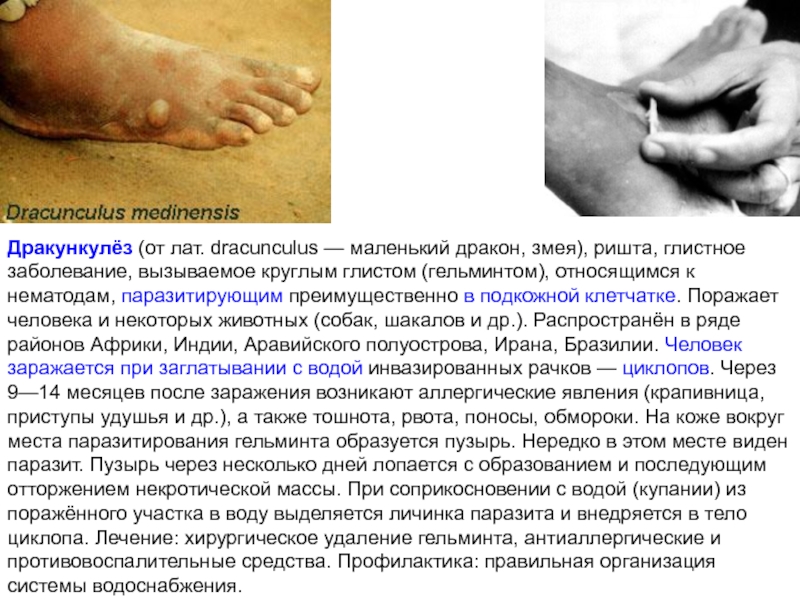 Слайд 3Дракункулёз (от лат. dracunculus — маленький дракон, змея), ришта, глистное заболевание,