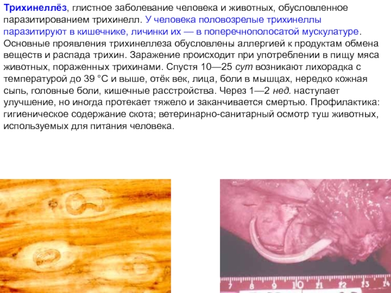 Слайд 7Трихинеллёз, глистное заболевание человека и животных, обусловленное паразитированием трихинелл. У человека