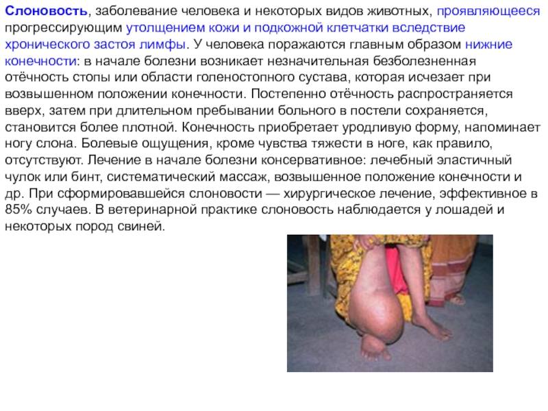 и подкожной клетчатки вследствие хронического застоя лимфы. У человека поражаются главным образом нижние конечности: в начале болезни возникает незначительная безболезненная отёчность стопы или области голеностопного сустава, которая исчезает при возвышенном положении конечности. Постепенно отёчность распространяется вверх, затем при длительном пребывании больного в постели сохраняется, становится более плотной. Конечность приобретает уродливую форму, напоминает ногу слона. Болевые ощущения, кроме чувства тяжести в ноге, как правило, отсутствуют. Лечение в начале болезни консервативное: лечебный эластичный чулок или бинт, систематический массаж, возвышенное положение конечности и др. При сформировавшейся слоновости — хирургическое лечение, эффективное в 85% случаев. В ветеринарной практике слоновость наблюдается у лошадей и некоторых пород свиней.