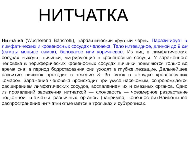Слайд 8Нитчатка (Wuchereria Bancrofti), паразитический круглый червь. Паразитирует в лимфатических и кровеносных