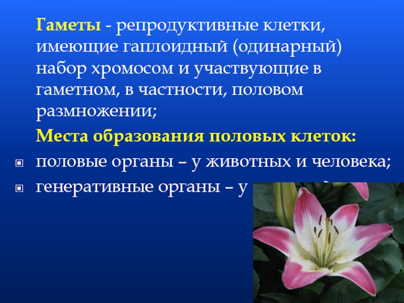 Слайд 4 Гаметы - репродуктивные клетки, имеющие гаплоидный (одинарный) набор хромосом