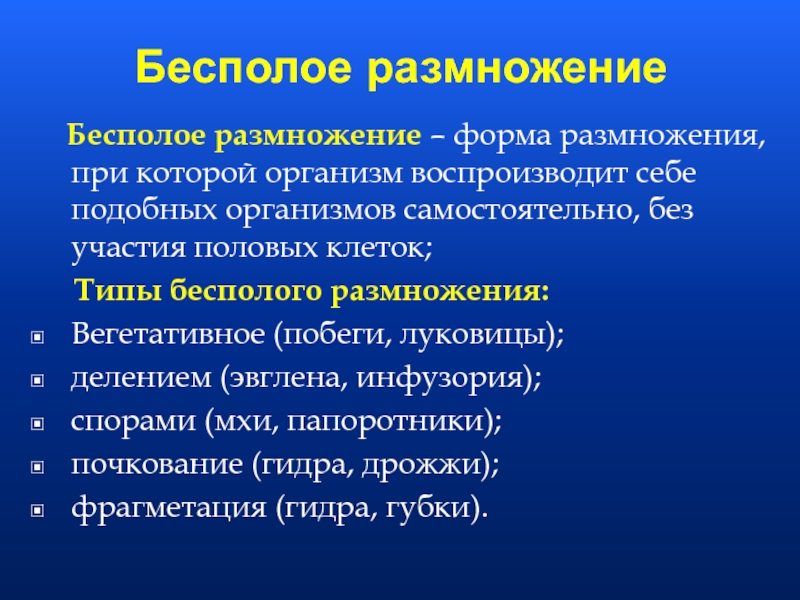 Бесполое размножение  Бесполое размножение – форма размножения, при которой организм воспроизводит себе подобных организмов самостоятельно, без