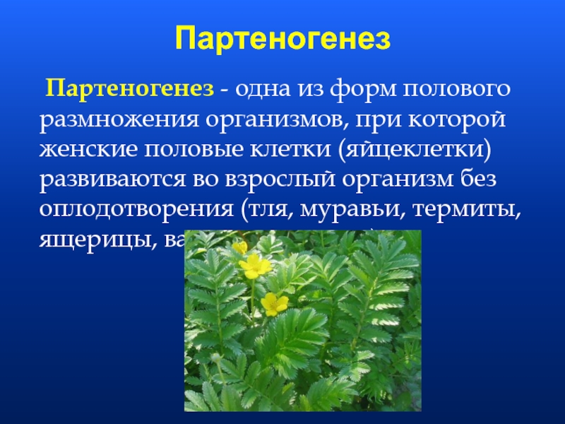 при которой женские половые клетки (яйцеклетки) развиваются во взрослый организм без оплодотворения (тля, муравьи, термиты, ящерицы, вараны, лапчатка).