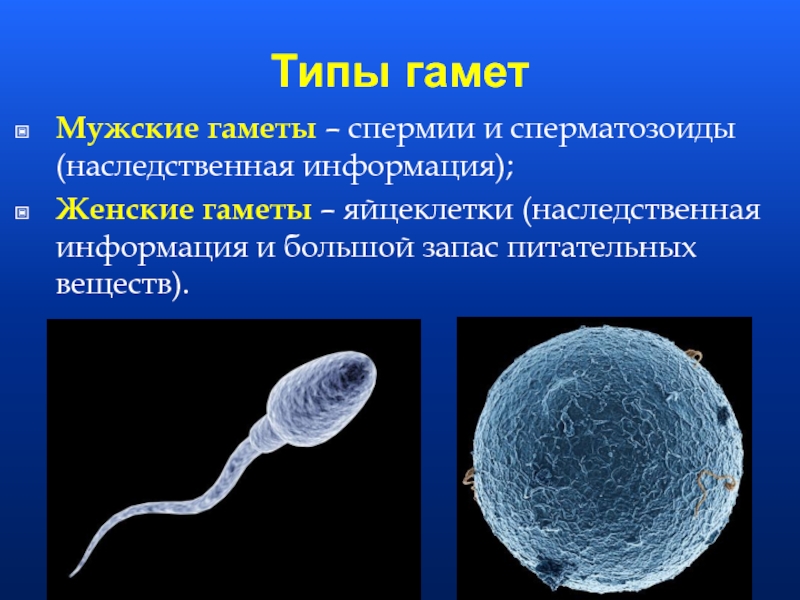 Типы гаметМужские гаметы – спермии и сперматозоиды (наследственная информация);Женские гаметы – яйцеклетки (наследственная информация и большой запас