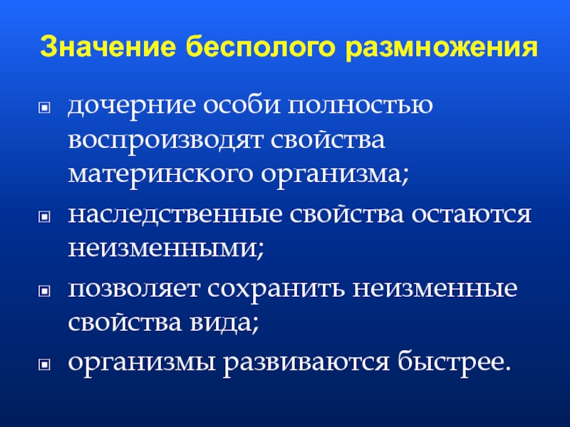 Значение бесполого размножениядочерние особи полностью воспроизводят свойства материнского организма;наследственные свойства остаются неизменными;позволяет сохранить неизменные свойства вида;организмы развиваются