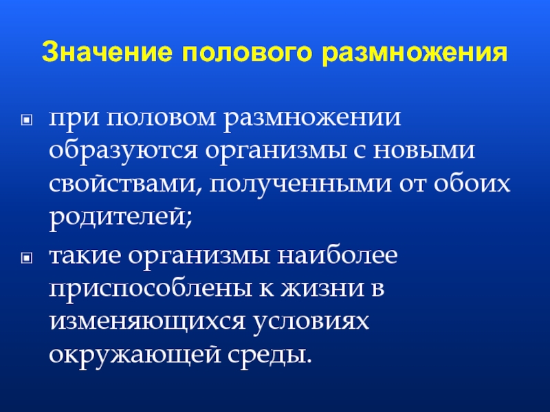 Значение полового размноженияпри половом размножении образуются организмы с новыми свойствами, полученными от обоих родителей; такие организмы наиболее