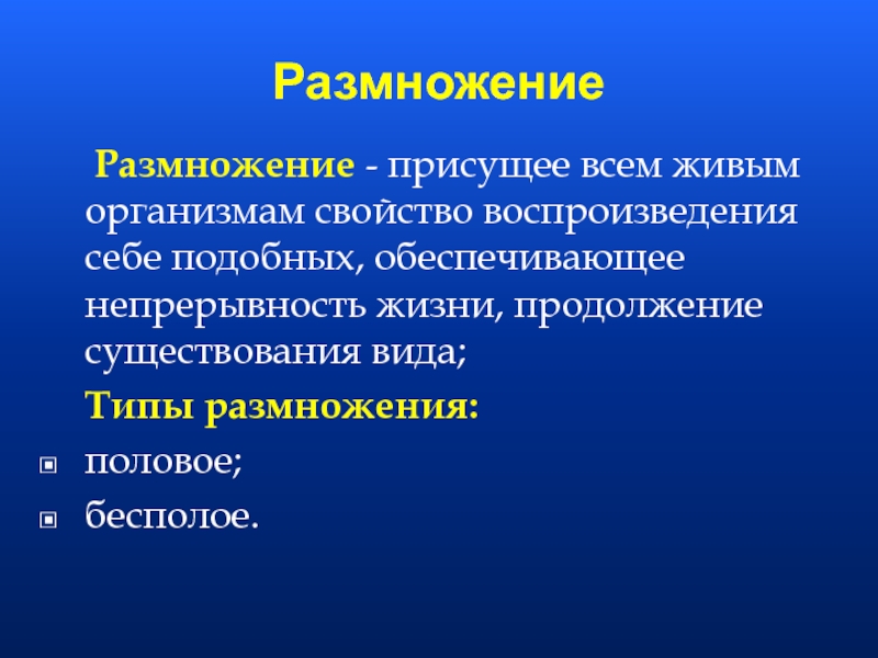 Размножение - присущее всем живым организмам свойство воспроизведения