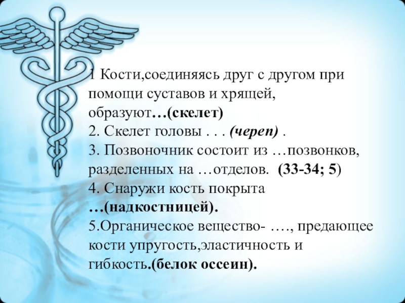 5.Органическое вещество- …., предающее кости упругость,эластичность и гибкость.(белок оссеин).