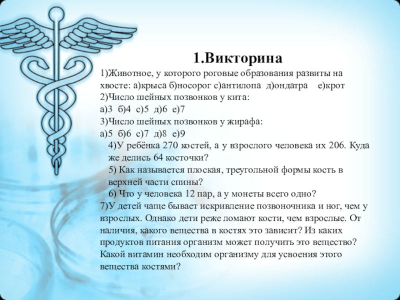 7)У детей чаще бывает искривление позвоночника и ног, чем у взрослых. Однако дети реже ломают кости, чем взрослые. От наличия, какого вещества в костях это зависит? Из каких продуктов питания организм может получить это вещество? Какой витамин необходим организму для усвоения этого вещества костями?