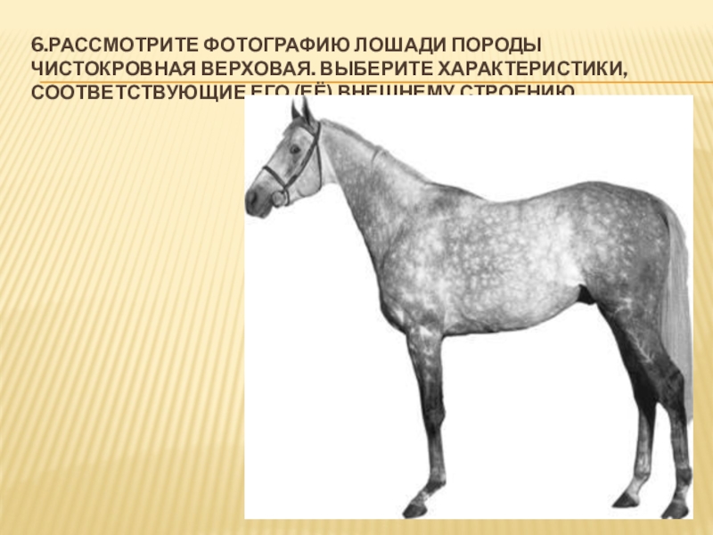 Слайд 196.Рассмотрите фотографию лошади породы чистокровная верховая. Выберите характеристики, соответствующие его (её)