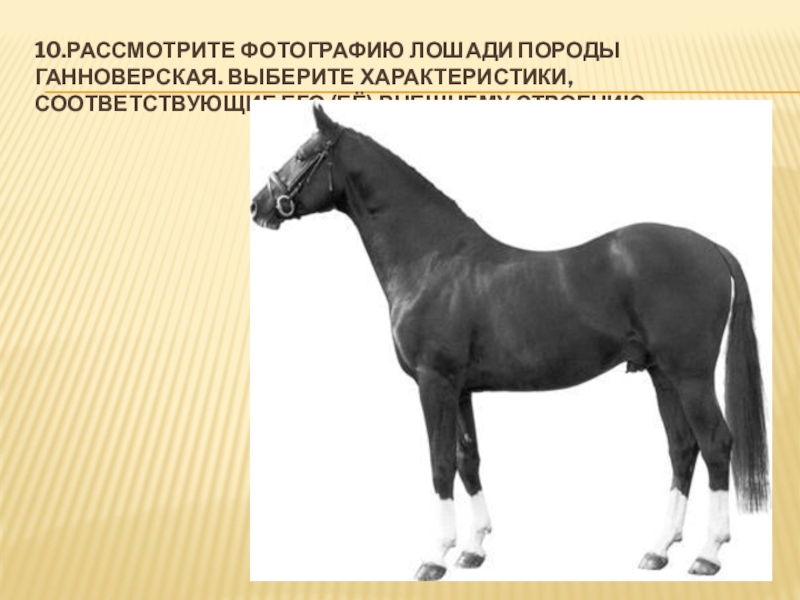 Слайд 2310.Рассмотрите фотографию лошади породы ганноверская. Выберите характеристики, соответствующие его (её) внешнему