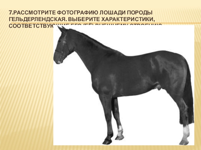 Слайд 207.Рассмотрите фотографию лошади породы гельдерлендская. Выберите характеристики, соответствующие его (её) внешнему