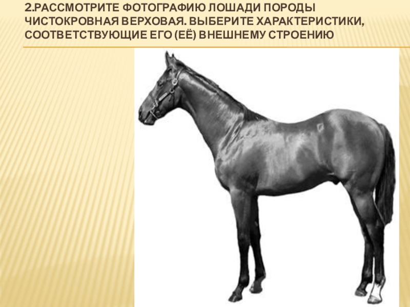 Слайд 142.Рассмотрите фотографию лошади породы чистокровная верховая. Выберите характеристики, соответствующие его (её)