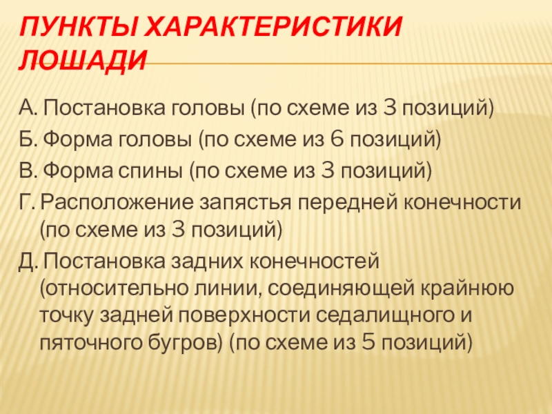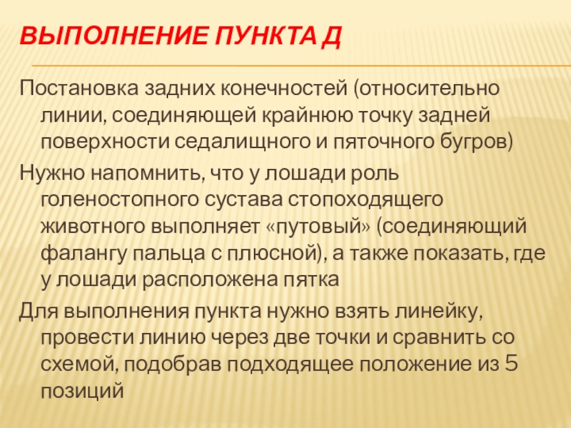 Д. Постановка задних конечностей (относительно линии, соединяющей крайнюю точку задней поверхности седалищного и пяточного бугров) (по схеме из 5 позиций)
