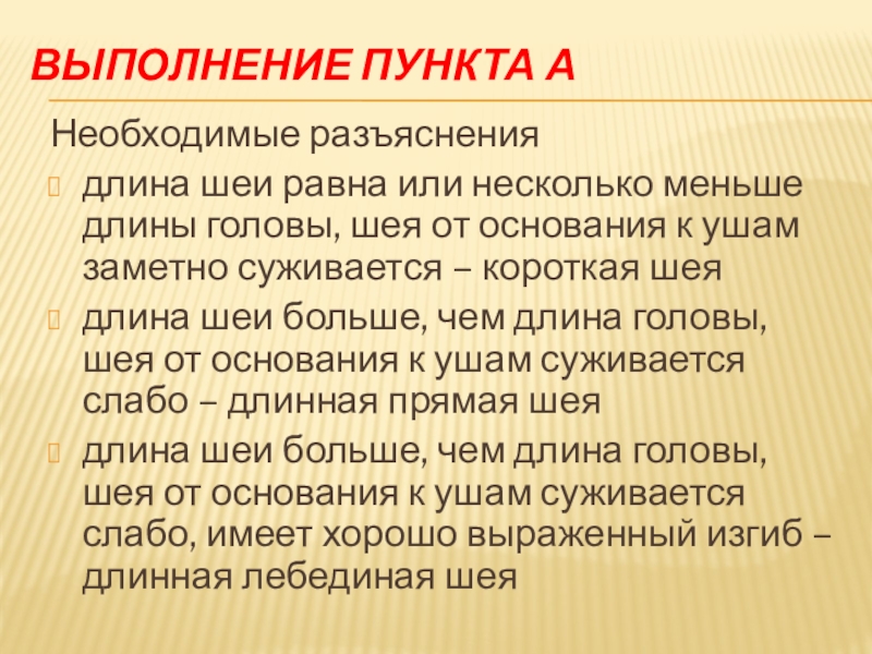 Слайд 7длина шеи равна или несколько меньше длины головы, шея от основания