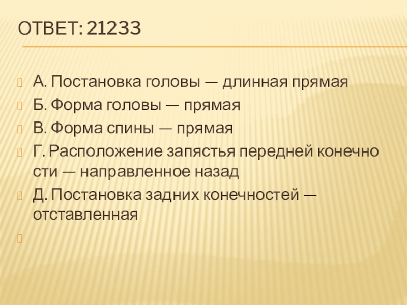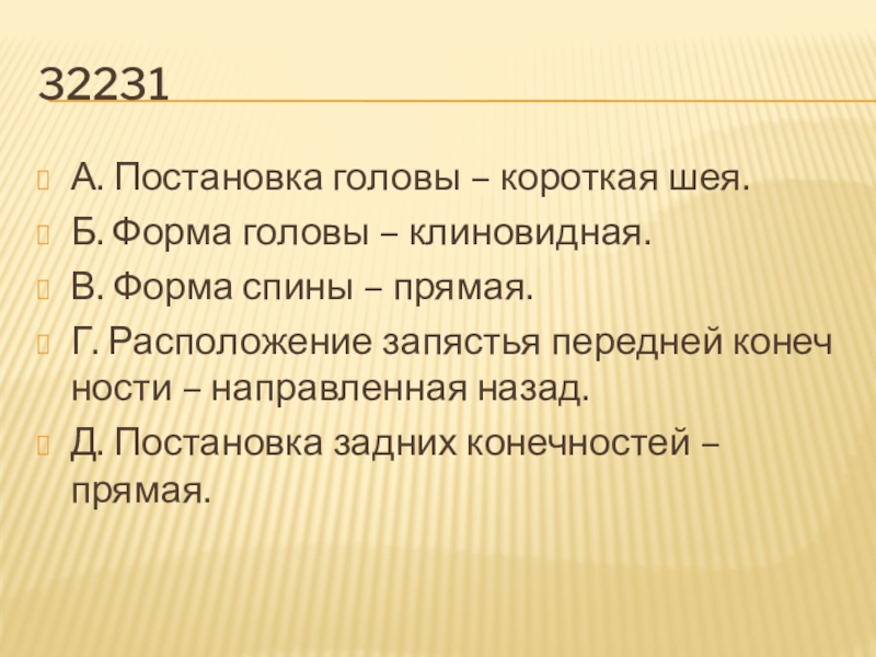 строению, по следующему плану: постановка головы, форма головы, форма спины, расположение запястья передней конечности, постановка задних конечностей. При выполнении работы используйте линейку.