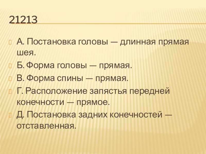длина шеи больше, чем длина головы, шея от основания к ушам суживается слабо – длинная прямая шея
