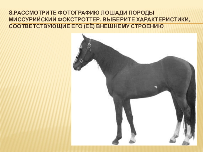 Слайд 218.Рассмотрите фотографию лошади породы миссурийский фокстроттер. Выберите характеристики, соответствующие его (её)