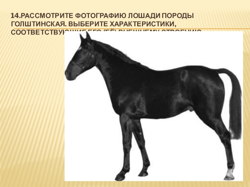 Слайд 3014.Рассмотрите фотографию лошади породы голштинская. Выберите характеристики, соответствующие его (её) внешнему