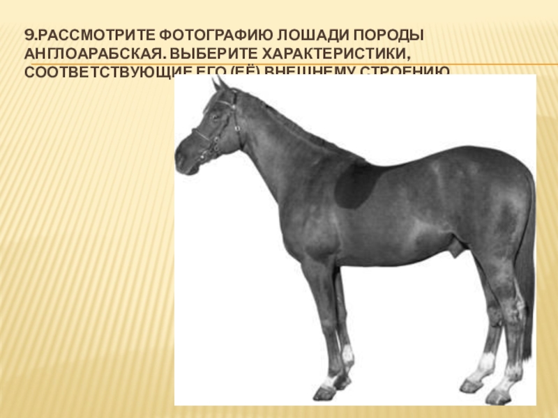 Слайд 229.Рассмотрите фотографию лошади породы англоарабская. Выберите характеристики, соответствующие его (её) внешнему