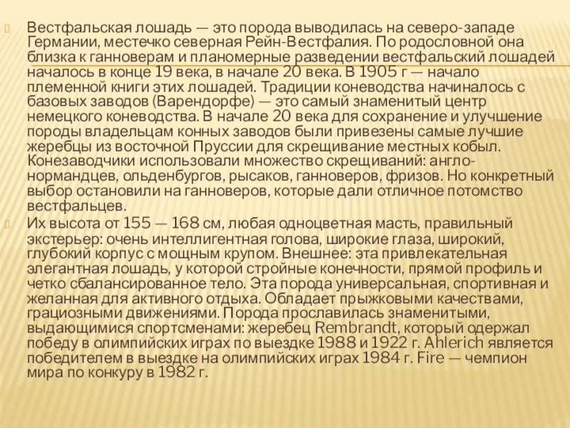 Слайд 27Вестфальская лошадь — это порода выводилась на северо-западе Германии, местечко северная