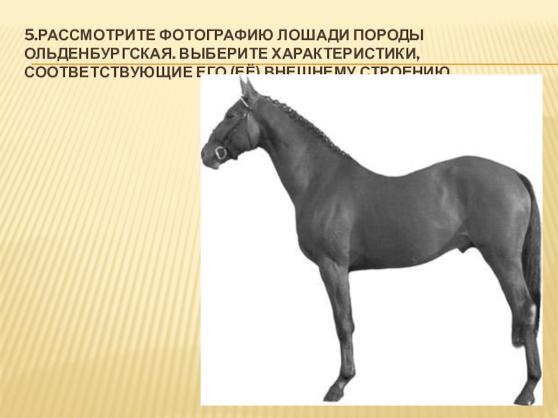 Слайд 175.Рассмотрите фотографию лошади породы ольденбургская. Выберите характеристики, соответствующие его (её) внешнему
