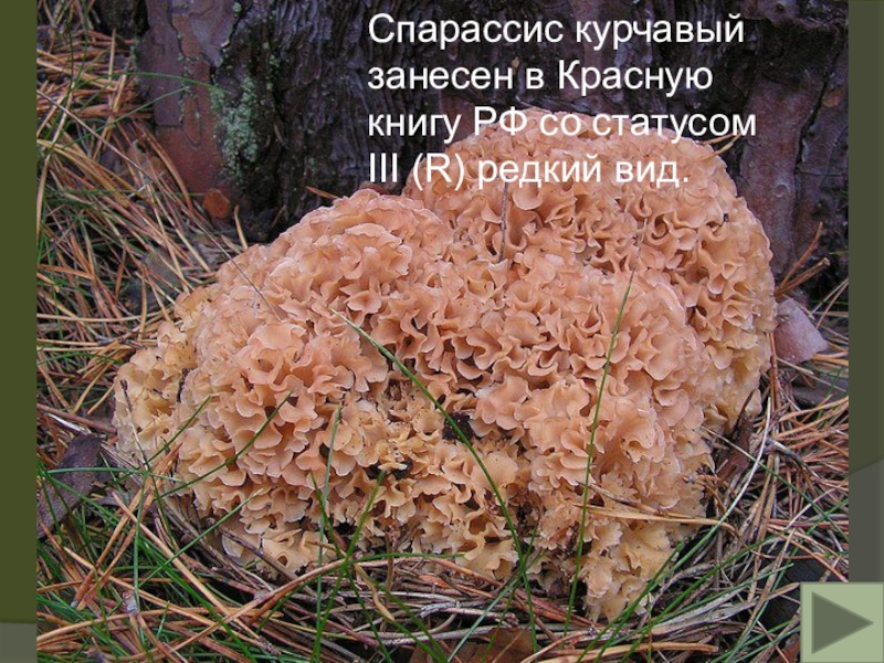 Слайд 24Спарассис курчавый занесен в Красную книгу РФ со статусом III (R)
